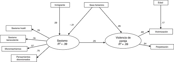 A través del correspondiente análisis factorial confirmatorio, se comprobó la idoneidad del modelo de medida. Todas las cargas factoriales resultaron significativas (p < .01). Los índices de ajuste para el modelo CFA eran adecuados: ML, χ2(23, N = 251) = 76.15, CFI = .938, NNFI = .903, IFI = .940, RMSEA = .072; Yuan-Bentler, χ2(23, N = 251) = 69.68, CFI = .949, NNFI = .920, IFI = .950, RMSEA = .066. En el modelo estructural los índices de ajuste eran acep con el método de máxima verosimilitud: ML, χ2(25, N = 251) = 76.21, CFI = .943, NNFI = .917, IFI = .942, RMSEA = .067, pero con el método robusto Yuan-Bentler, χ2(25, N = 251) = 65.51, CFI = .959, NNFI = .940, IFI = .959, RMSEA = .057, mejoraba ligeramente el ajuste de los datos al modelo. Todas las cargas factoriales y variables latentes eran significativas para p < .001. El modelo estructural explicaba el 9% de la varianza de la violencia de pareja (ver figura 4). El sexismo predecía significativamente la violencia de pareja (β = .25, p < .001). A su vez el sexo femenino era también un predictor significativo de la violencia de pareja (β = .26, p < .001) y de un menor nivel de sexismo (β = -.21, p < .001). La condición de inmigrante predecía el sexismo (β = .59, p < .001) y la edad predecía la victimización (β = .17, p < .01), lo cual significa que los participantes de más edad manifiestan haber sido víctimas de su pareja con más frecuencia que los participantes más jóvenes.
