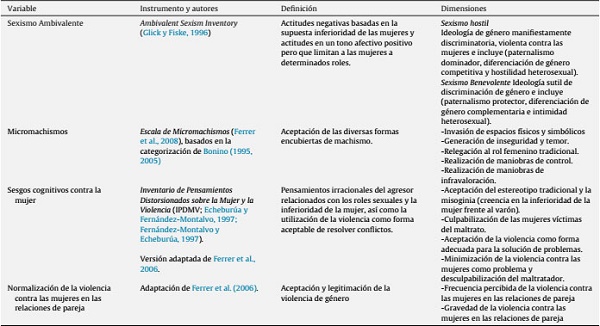 El sexismo es un constructo multidimensional como señalan Glick y Fiske (1996), con una variada terminología utilizada para hacer referencia a las creencias y actitudes sexistas (creencias sexistas, sexismo hostil, micromachismos, sesgos cognitivos contra la mujer o actitudes tolerantes con la violencia contra las mujeres). Es posible que la diversidad de manifestaciones del sexismo analizadas en los estudios influya en los resultados obtenidos en los diferentes estudios. En la tabla 1 se incluyen algunos de los conceptos e instrumentos más utilizados en la evaluación del sexismo.
