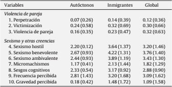 En resumen, en esta investigación se han analizado diferentes formas de sexismo (sexismo hostil, sexismo benevolente, micromachismos y sesgos cognitivos contra la mujer) pero esta variable no se puede considerar un predictor válido de la violencia de pareja ni en hombres ni en mujeres. De forma consistente se ha encontrado que la población inmigrante presenta una mayor vulnerabilidad ante creencias y actitudes tolerantes con la violencia contra las mujeres, dato que convendría tener en cuenta en las políticas de integración social de nuestro país para que la igualdad de género llegue a todos los hogares.