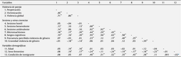Teniendo en cuenta la muestra completa, la perpetración de violencia de pareja correlacionaba significativamente y de forma moderada con victimización, sexismo benevolente, sexismo ambivalente, micromachismos y sesgos cognitivos. Del mismo modo, la victimización se asociaba con micromachismos, sesgos cognitivos, edad, así como con una menor gravedad percibida. Además, en general las diferentes medidas de sexismo se relacionaban significativamente entre sí. La violencia de pareja global se asociaba sobre todo con micromachismos (r = .20, p = .003) y sesgos cognitivos contra la mujer (r = .20, p = .005).