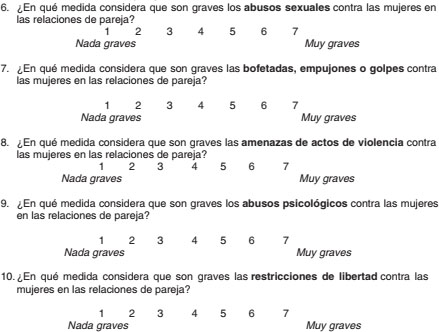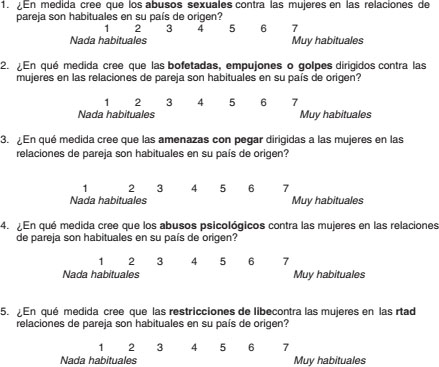 Normalización de la violencia de género (adaptación de la escala de Ferrer, Bosch y Navarro, 2011). La normalización de la violencia contra las mujeres en las relaciones de pareja incluye tanto la frecuencia percibida de este tipo de violencia en el país de origen como la gravedad percibida. La frecuencia percibida se evaluó a través de 5 ítems, en la que se preguntaba a los participantes hasta qué punto eran habituales en el país de origen determinadas conductas violentas contra las mujeres (abusos sexuales, abusos físicos, amenazas, abusos psicológicos y restricciones de libertad) (ver Anexo). Para evaluar la gravedad de la violencia contra las mujeres en las relaciones de pareja los participantes tenían que valorar la gravedad de los cinco tipos de abuso mencionados anteriormente (ver Anexo). El formato de respuesta en ambos casos era una escala tipo Likert de 7 puntos (1 = nada habituales o nada graves, 7 = muy habituales o muy graves). Estas dos escalas están basadas en la valoración de la frecuencia percibida de la violencia contra las mujeres en las relaciones de pareja en sus diferentes manifestaciones en España realizada por Ferrer et al. (2011). El análisis factorial de componentes principales y rotación Varimax arrojó una estructura de dos factores (frecuencia percibida y gravedad de la violencia contra las mujeres en las relaciones de pareja) cada uno de los factores con valores propios superiores a 1, que en conjunto explicaban el 73% de la varianza total. La consistencia interna referente a la frecuencia percibida (α = .87) y a la gravedad percibida (α = .93) de la violencia contra las mujeres eran excelentes.