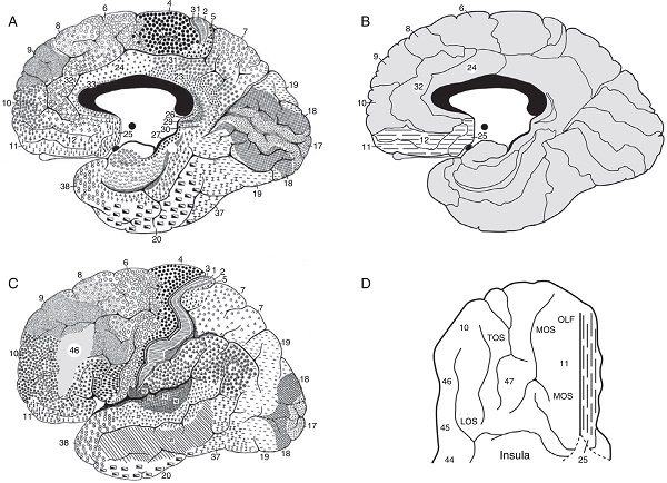 BA: Brodmann areas; ACC: anterior cingulate cortex (BA 32, 33, 24 and 25) (Fig. 1A); preACC: pregenual anterior cingulate cortex (BA 32, 33 and 24) (Fig. 1A); subACC: subgenual anterior cingulate cortex (BA 24, 32, 33 and 35) (Fig. 1A); PCC: posterior cingulate cortex (BA 23, 29, 30, 31) (Fig. 1A); PFC: prefrontal cortex; dlPFC: dorsolateral prefrontal cortex (BA 46) (Fig. 1C); ofPFC: orbitofrontal prefrontal cortex (BA 11 and 47) (Fig. 1C); vmPFC: ventromedial prefrontal cortex (BA 12) (Figs. 1B, D); mPFC: medial prefrontal cortex (BA 32 and 12) (Fig. 1B).
