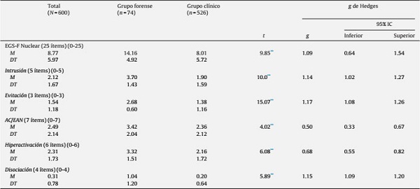 Se encontraron diferencias estadísticamente significativas entre los dos grupos tanto en la puntuación nuclear del TEPT como en las distintas subescalas de la EGS-F, con valores significativamente más altos en el grupo forense que en el clínico (ver tabla 1).