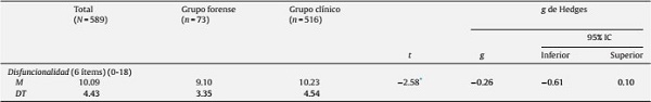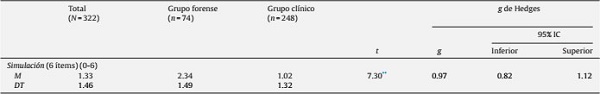 Al considerar a todos los participantes se obtuvo un alfa de Cronbach de .650. Se encontraron diferencias estadísticamente significativas entre el grupo forense (mayores puntuaciones) y el grupo clínico en la puntuación global de la subescala de simulación de la EGS-F, con una magnitud grande (ver tabla 3).