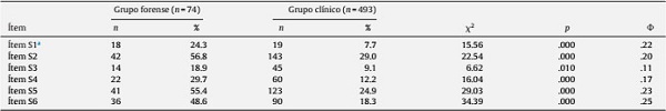 A su vez, cada uno de los seis ítems de la subescala de simulación discriminaba también entre los grupos forense y clínico, con mayores puntuaciones para el grupo forense, aunque con magnitudes pequeñas (ver tabla 4).