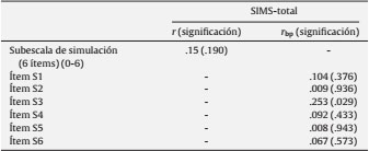 La relación entre la puntuación total de la subescala de simulación de la EGS-F y el SIMS-total en el grupo forense no fue estadísticamente significativa. Sin embargo, al analizar la relación entre cada uno de los seis ítems de la subescala de simulación y el SIMS-total se encontró una relación estadísticamente significativa y de magnitud pequeña-media con el siguiente ítem: desde que le sucedió esto, ¿le pasa a veces que puede hablar con otro yo que está fuera de usted?. Con el resto de ítems los valores de la correlación oscilaron entre .01 y .10 (estadísticamente no significativos) (ver tabla 5).
