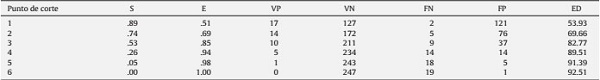 En la tabla 6 se señalan los diferentes índices descriptivos para definir los puntos de corte de la puntuación total en la subescala de simulación. Así, con un punto de corte de 2 se clasificaría correctamente al 74% de las personas del grupo forense de probables simuladores (14 verdaderos positivos y 5 falsos negativos).