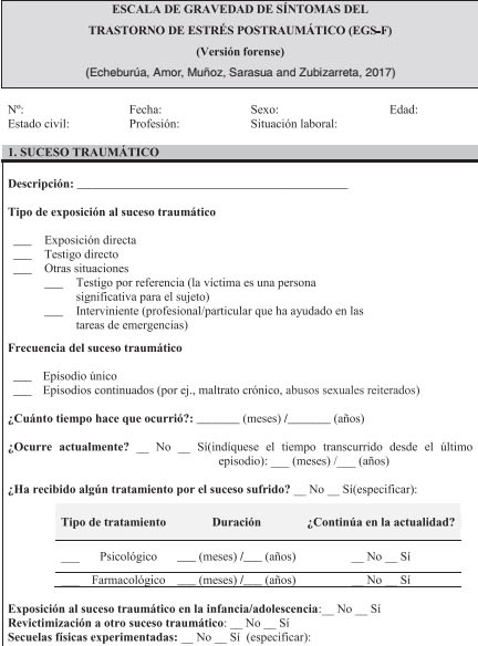La escala EGS-F está elaborada a partir de un instrumento clínico (EGS-R) y ha sido validada con un grupo forense en esta investigación. Su objetivo es contribuir a la evaluación de la gravedad de los síntomas del TEPT en personas adultas, así como de su grado de disfuncionalidad en la vida cotidiana, en un contexto judicial. La EGS-F cuenta con un control específico de las respuestas de simulación, lo que la convierte en una prueba adecuada para su uso forense. Al margen de la existencia de un inventario genérico para la simulación de síntomas (el SIMS) (González Ordi y Santamaría, 2009), se trata de la primera prueba heteroaplicada creada en español para la evaluación del TEPT en el contexto forense, que resulta breve y sencilla de corregir. El formato elegido ha sido el de una entrevista estructurada porque, a diferencia de los autoinformes, resulta más difícil distorsionar la información aportada y además se puede aplicar en pacientes con dificultades de concentración o con problemas para entender el lenguaje escrito. Las propiedades psicométricas de la EGS-R, que es la base de esta prueba, se han descrito en un estudio reciente (Echeburúa et al., 2016).