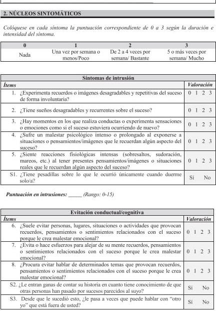 Escala Forense de Gravedad de Síntomas del Trastorno de Estrés Postraumático (EGS-F). Se trata de un instrumento de evaluación estructurado, de administración heteroaplicada, en un formato de tipo Likert de 0 a 3 según la frecuencia e intensidad de los síntomas. Esta escala cuenta con una parte nuclear (EGS-R) y con una parte complementaria. La parte nuclear consta de 21 ítems centrales (rango: 0-63 puntos) en correspondencia con los criterios diagnósticos del DSM-5 (APA, 2013): 5 hacen referencia a la intrusión (rango: 0-15), 3 a la evitación conductual/cognitiva (rango: 0-9), 7 a las alteraciones cognitivas y al estado de ánimo negativo (AC/EAN) (rango: 0-21) y 6 a la hiperactivación (rango: 0-18), así como 4 adicionales referidos a la disociación (rango: 0-12). Esta parte nuclear (EGS-R) ha mostrado unas propiedades psicométricas adecuadas en la población española: una consistencia interna satisfactoria para la puntuación total de 21 ítems ( = .91), así como para los cuatro núcleos de síntomas específicos del TEPT (valores comprendidos entre .72 y .79); a su vez, la consistencia interna de los ítems adicionales sobre síntomas disociativos fue de .73. Por otra parte, la eficacia diagnóstica de esta escala es muy alta (82.5%) si se establece un punto de corte global de 20 en la parte nuclear de 21 ítems y unos puntos de corte parciales de 4, 4, 6 y 6 en las subescalas de intrusión, evitación, alteraciones cognitivas/estado de ánimo negativo e hiperactivación, respectivamente (Echeburúa et al., 2016).
