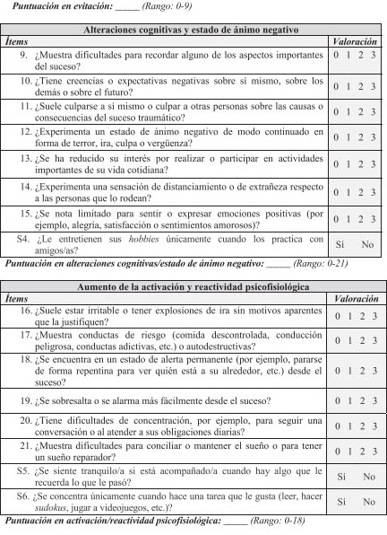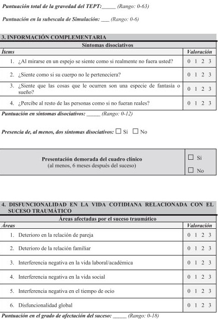 La parte complementaria consta de una subescala de disfuncionalidad (6 ítems, rango: 0-18) para evaluar el grado de afectación global relacionado con el suceso traumático ( = .82) y también de una subescala de simulación de 6 ítems binarios (sí-no, rango: 0-6), elaborada específicamente para este estudio.