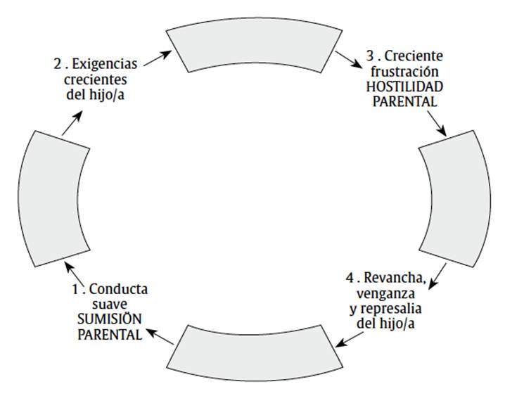 A este respecto, los estudios efectuados de Bugental, Blue y Cuzcosa (1989) demuestran que cuanto más impotentes y confusos se sientan los padres más elevado será el riesgo de que pierdan el control de la situación y sobre ellos mismos. Por consiguiente, según los autores, cuanto más violentos sean los arrebatos parentales más violentos serán las conductas del hijo y el resultado será la claudicación de los progenitores para retornar la paz al hogar. De este modo, el círculo de la violencia filio-parental oscila entre ceder y devolver el golpe.