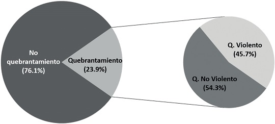 En la muestra estudiada se registraron 1,134 casos con al menos una denuncia por quebrantamiento. Del total de casos con quebrantamientos, 518 fueron violentos y 616 no violentos (Figura 1).