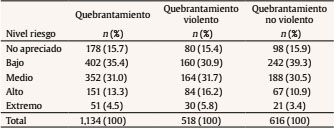 Se obtienen resultados estadísticamente significativos, 2(1, n = 4,129) =16.49, p < .001, para las variables quebrantamiento violento y riesgo. Se alcanza un valor OR = 1.67, IC 95% [1.30, 2.15] como parámetro de discriminación.