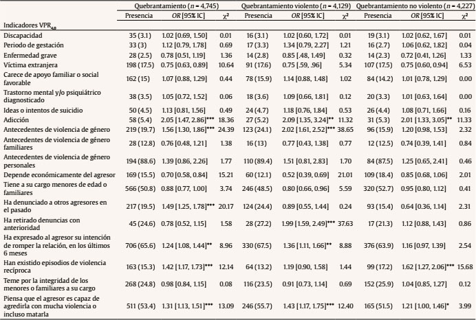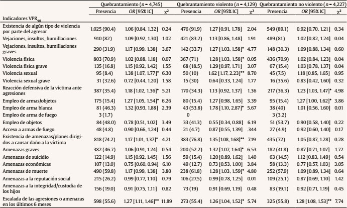 En la Tabla 2 pueden apreciarse los indicadores del episodio denunciado que muestran asociación con el quebrantamiento. La violencia sexual ofrece el valor de riesgo más elevado en comparación con el resto de los indicadores.
