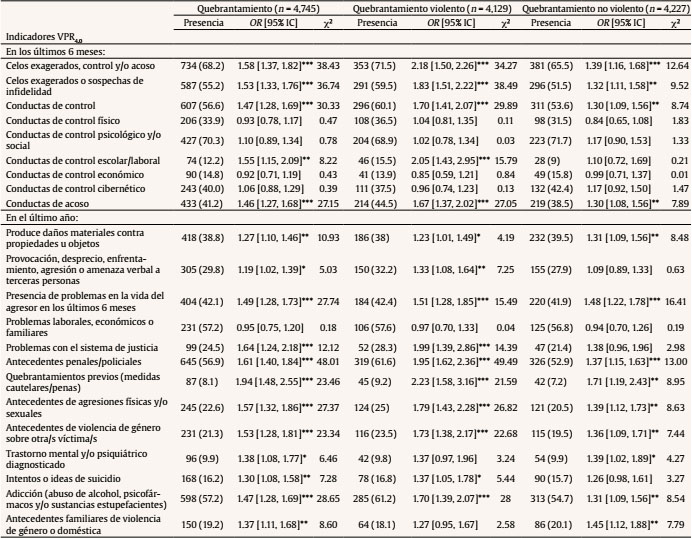 Al igual que en el caso del quebrantamiento, de las características del agresor (Tabla 3), la existencia de antecedentes penales/policiales, el estrés derivado de los problemas judiciales, los antecedentes violentos violencia de género sobre otra/s víctima/s, agresiones físicas y/o sexuales y la problemática toxicológica muestran asociación con el quebrantamiento violento. Los valores OR destacan como predictores los comportamientos hacia la pareja (control, acoso y celos) y los quebrantamientos previos de medidas cautelares/penales para este tipo de quebrantamiento.
