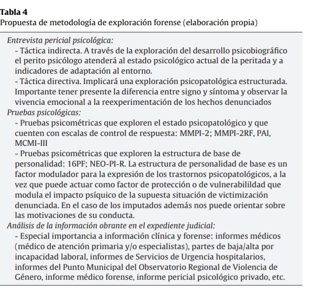 Con la evaluación de esta área, lo que pretende el perito psicó- logo es identificar el posible impacto psíquico que la exposición a la supuesta victimización en la relación de pareja denunciada haya podido dejar en la denunciante (huella psicopatológica del delito). Una propuesta de metodología de exploración forense está expuesta en la tabla 4.