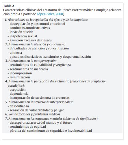 Estas graves consecuencias para el estado psicológico de la víc- tima son explicables por las características de este tipo de violencia: elevada frecuencia, intensidad, cronicidad, falta de predictibilidad y vinculación afectiva con el agresor. Este tipo de victimizaciones produce consecuencias psicológicas generalizadas, que se han agrupado en una entidad nosológica independiente (el trastorno de estrés postraumático complejo), aún no reconocida por el DSM-5, que implicaría alteraciones en la percepción de sí mismo, de la afectividad y del mundo y que generaría una grave inadaptación de la víctima a los distintos ámbitos de su vida (personal, social, familiar y laboral) (Herman, 1992; Taylor, Asmundson y Carleton, 2006). Las características clínicas de este trastorno se recogen en la tabla 2.