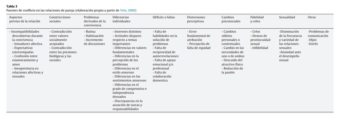La relación de pareja pasa a lo largo del tiempo por diferentes etapas (Yela, 2000): a) fase de enamoramiento (intensa pasión–atracción física y expectativas románticas– y deseo sexual), b) fase de amor romántico-pasional (estabilidad de la pasión, desarrollo de una fuerte intimidad y desarrollo del compromiso) y c) fase de amor compañero (descenso de la pasión, aumento de la intimidad y aumento del compromiso). Alcanzada esta última etapa, la relación de pareja puede consolidarse y estabilizarse o puede comenzar, antes o después, a deteriorarse, lo que se acentúa si hay un déficit de habilidades en el proceso de comunicación. En la tabla 3 se recogen las principales fuentes de conflicto en la relación de pareja. Por otra parte, en muchas ocasiones las parejas ponen en marcha estrategias inadecuadas de resolución de conflictos, lo que contribuye a aumentar las fricciones entre ellos. En estos casos mezclan en sus discusiones toda una gama de otros problemas secundarios e irrelevantes que suelen ser fuente habitual de conflicto. El discurso se convierte en una larga lista de acusaciones, reproches y críticas mutuas que les apartan de sus objetivos prioritarios (Labrador,2015).