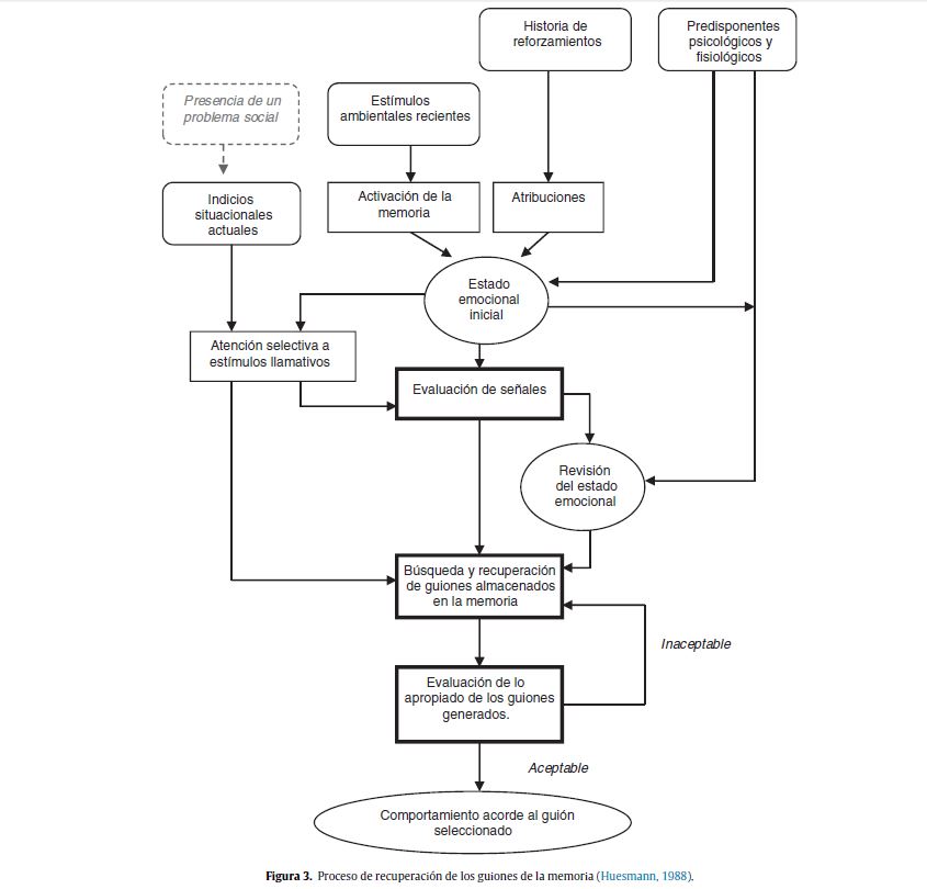 Tomando como base esta idea, el modelo explica el comportamiento agresivo como una consecuencia del aprendizaje de guiones cognitivos agresivos durante la infancia, los cuales son almacenados en la memoria y recuperados de manera habitual en distintas situaciones sociales. Como puede observarse en este modelo de toma de decisiones, existen tres momentos clave en el procesamiento de la información: la evaluación de las señales ambientales, la búsqueda y recuperación de guiones en la memoria y la evaluación de los guiones generados antes de emitir un comportamiento (fig. 3).