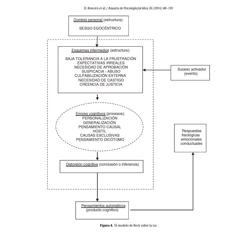 En resumen, para explicar los trastornos emocionales relacionados con la ira según la teoría de Beck, los esquemas son concebidos como causas remotas, estructuras latentes que se activan ante un suceso específico, dando como resultado una interpretación distorsionada de la situación, cuyo producto serían los pensamientos automáticos específicos de la ira-hostilidad. Estos pensamientos automáticos negativos son concebidos como las causas inmediatas de la ira y serían los responsables directos de las respuestas emocionales, fisiológicas y conductuales subsiguientes, entre ellas, la agresión (ver fig. 4).