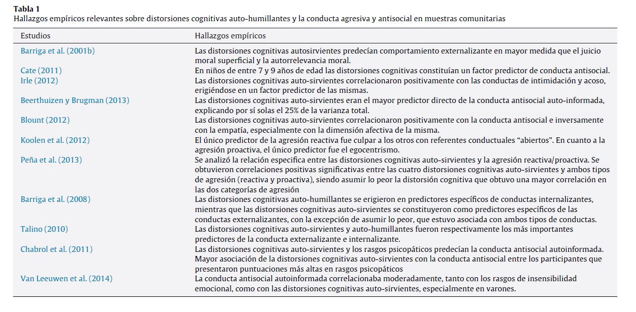 La tabla 1 muestra un resumen de los hallazgos más relevantes que los estudios han mostrado sobre la relación entre distorsiones cognitivas auto-sirvientes y conducta antisocial en muestras comunitarias.