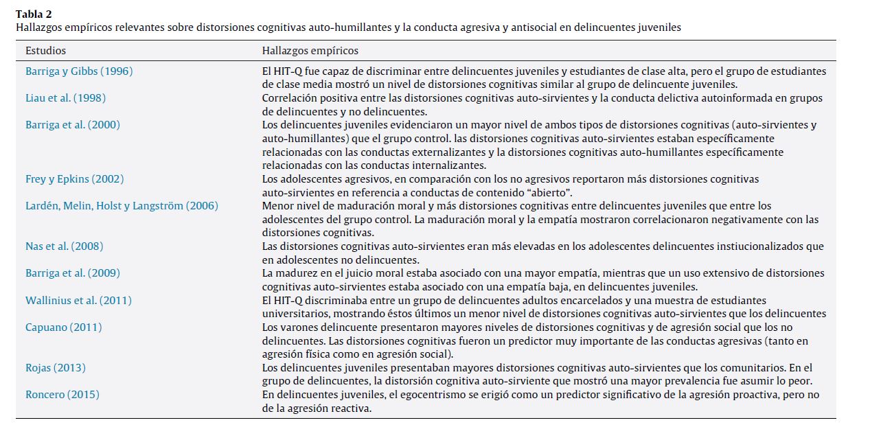 La tabla 2 muestra un resumen de los hallazgos más relevantes que los estudios han mostrado sobre la relación entre distorsiones cognitivas auto-sirvientes y conducta antisocial en delincuentes juveniles.