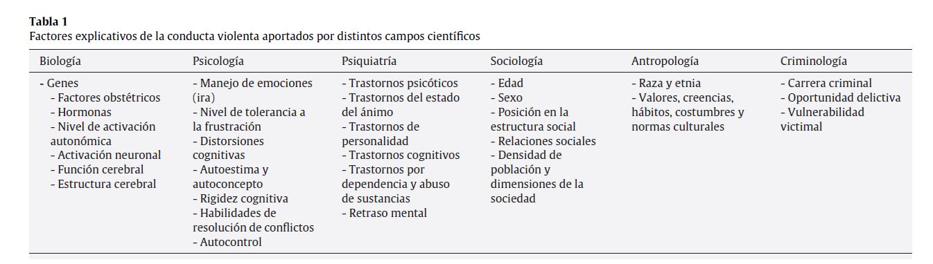 El punto de partida de cualquier actividad predictiva es definir de forma clara y operativa la variable a predecir, en este caso, la conducta violenta. Esta labor no es fácil desde el punto de vista científico. La violencia es un fenómeno complejo, poliédrico y multidimensional (Garrido y Sobral, 2008), que ha sido definido de manera distinta en diferentes disciplinas, lo que ha dificultado su abordaje científico (Gallardo-Pujol, Forero, Maydeu-Olivares y Andrés-Pueyo, 2009; Ramírez y Andreu, 2006). No obstante, tres elementos aparecen en la mayoría de las definiciones utilizadas (Carrasco y González, 2006): a) su carácter intencional —busca un fin concreto de muy diversa índole., b) las consecuencias negativas o el peligro que conlleva, sobre objetos, otras personas o uno mismo y c) su variedad expresiva —física, psíquica, sexual o por privación o abandono.. En este sentido, la OMS (2002) atendiendo a la direccionalidad de la violencia .autoinflingida, interpersonal o colectiva., diferencia más de sesenta tipos de conductas violentas. En la predicción del riesgo se ha puesto la atención en la conducta más grave: la violencia física y sexual. Así, el concepto jurídico de peligrosidad criminal tradicionalmente ha hecho referencia a la delincuencia violenta grave, sistemática y reincidente (Andrés- Pueyo, 2013). Distintos campos del conocimiento han aportado modelos explicativos sobre la génesis de la conducta violenta, en un principio con carácter determinista o monocausal. Para la postura determinista la ley causal es fundamental: cada acontecimiento tiene una causa determinada y a su vez un efecto concreto (Fäh, Rainer y Killias, 2006). Estas explicaciones contribuyeron a generar una amplia gama de elementos o variables explicativas de la conducta violenta, recogidas y analizadas en la actualidad como factores de riesgo (ver tabla 1).