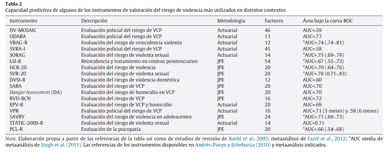 Los estudios de revisión sobre la capacidad predictiva de los actuales instrumentos de valoración del riesgo, tanto actuariales como de juicio clínico estructurado, arrojan puntuaciones de un AUC de .59-.77. Las pruebas elaboradas específicamente en el contexto español se encuentran también dentro de estos márgenes (vide tabla 2). En este sentido, algunos autores sen˜alan que puede que se haya tocado techo respecto a la capacidad predictiva y que aumentar el número de factores no incrementa su rendimiento, proponiendo centrar los esfuerzos en la comprensión de las causas de la violencia y la prevención de la reincidencia (Monahan y Skeem, 2014). Para optimizar este segundo objetivo, los parámetros de calibración resultan especialmente importantes —más allá de la capacidad predictiva de la prueba a partir del AUC—, considerando que la clasificación correcta de los sujetos de mayor riesgo se complementa de forma adecuada con una gestión del riesgo más eficiente al dirigir hacia este grupo los recursos de protección de víctimas o tratamientos específicos. En este sentido, desde el punto de vista social, hemos de tener en cuenta que los recursos no son ilimitados.