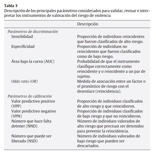 El mejor conocimiento sobre la calidad técnica de los distintos instrumentos de evaluación del riesgo descansa especialmente en la validez predictiva, que engloba diferentes indicadores de desempeño (Hilton et al., 2007; Rossegger, Endrass, Gerth y Singh, 2014). La capacidad predictiva o validez de estos protocolos permite evaluar los casos en un marco asociativo mediante los factores de riesgo/protección presentes y la probabilidad de expresar una conducta violenta, más o menos específica en función del instrumento. La validez predictiva se concreta separando la «discriminación», referida a la capacidad de diferenciar entre reincidentes y no reincidentes futuros, del «calibrado» del instrumento –o proceso seguido por el profesional en el caso del juicio clínico estructurado– mediante las estimaciones de riesgo previsto y de ocurrencia observada, permitiendo además clasificar tasas adecuadas en las categorías de riesgo que tenga el instrumento y el rendimiento que muestra la guía para valorar los casos. La tabla 3 resume los distintos parámetros de interés en el análisis, construcción y validación de herramientas de valoración del riesgo de violencia.