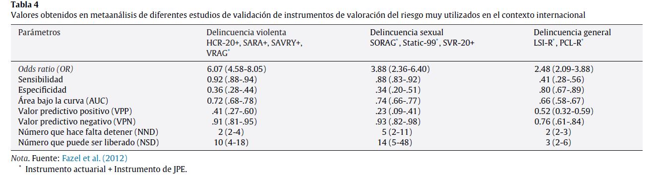 Atendiendo al metaanálisis de Singh et al. (2012) por su actualidad, gran amplitud y rigurosidad en su conjunto, se observan mejores resultados cuando se evalúan poblaciones o formas de criminalidad específicas y cuando se estima la delincuencia violenta en lugar de la delincuencia general, si bien con diferencias atendiendo al instrumento empleado (e.g., LSI-R vs. SVR-20, vide tabla 2). En este sentido, en el ámbito forense resulta recomendable que el protocolo de evaluación del riesgo responda a estas dos cuestiones y de forma singular que se trate de una herramienta construida para valorar el riesgo específico que solicitan los jueces; de otra forma, el margen de error aumenta al seleccionar una prueba inadecuada por incluir factores e indicadores poco precisos –un reto permanente para este campo de la psicología.