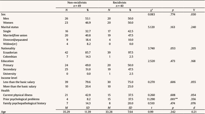 From a sociodemographic viewpoint, as shown in Table 1, there were no differences between recidivist and non-recidivist inmates in nationality, educational level, marital status, number of children, income level, housing type, kind of work prior to incarceration, and occupation in prison. However, there were differences in the presence of psychological problems prior to imprisonment, 2(1) = 11.28, p <.001, V = .35. In this sense, 15 out of 40 recidivists (37.5%) had prior psychological problems versus 4 out of 49 non-recidivists (8.16%).