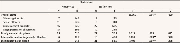 From a criminal viewpoint, 48% the sample had committed offences against property, and 28% illegal possession of narcotics. To a lesser extent, they presented sexual offences (12%) and offences against persons (11%). As seen in Table 2, recidivists committed more crimes against property, had a longer criminal history because they had more frequently been interned in centers for juvenile offenders, and presented more disciplinary problems in prison.