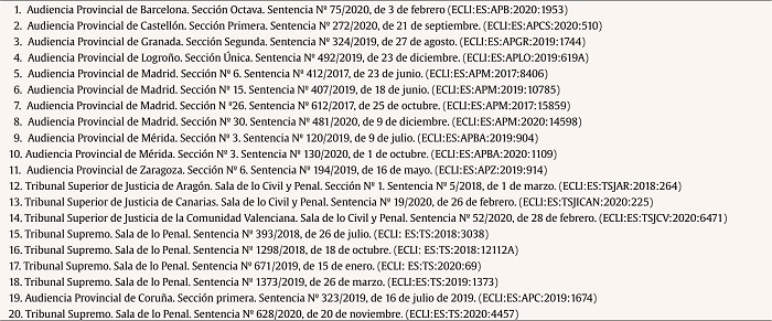 Las sentencias empleadas se referenciarán con la letra S seguida del número según aparecen ordenadas en la Tabla 1, pudiendo consultar el contenido de cada sentencia a través de los identificadores ECLI proporcionados.
