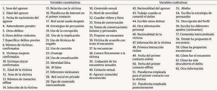 Para la codificación de las sentencias se crearon 62 variables cuantitativas y cualitativas (ver Tabla 2, donde aparecen enumeradas, y ver el Excel descargable a través del repositorio3), de las cuales finalmente se excluyeron cuatro variables por falta de información en varias sentencias (duración del contacto, nacionalidad víctima, orientación sexual víctima, tipo de víctima).