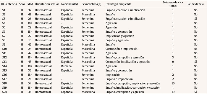 Se obtuvo finalmente una muestra no probabilística de 20 sentencias españolas entre los años 2017 y 2020 que aportan información sobre 20 agresores y 65 víctimas. Veinte sentencias pueden parecer un número limitado, si bien, dado que el delito es reciente en nuestro ordenamiento jurídico, su proceso de instrucción complejo y la lentitud de los procesos judiciales, parece una cantidad ajustada para servir al menos como una primera aproximación al fenómeno criminológico reciente en España. Ahora bien, siempre se deberá mantener cautela sobre los resultados encontrados, ya que se corresponden con los casos denunciados y no reflejará el fenómeno completo porque la cifra negra o la ausencia de denuncia en delitos sexuales que involucran a menores es elevada (Del Real Castrillo, 2019; Gewirtz-Meydan y Finkelhor, 2020).