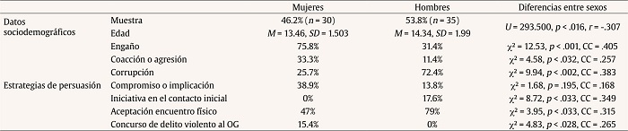 El porcentaje de agresores que contactó con víctimas mujeres fue mayor que el que se acercó a víctimas varones (el 65% frente al 35%). En dos sentencias (S9, S14) aparece que los menores ya habían mantenido encuentros sexuales con adultos. En la Tabla 4 se incluyen los datos sociodemográficos de las víctimas, estrategias de persuasión empleadas y diferencias entre sexos