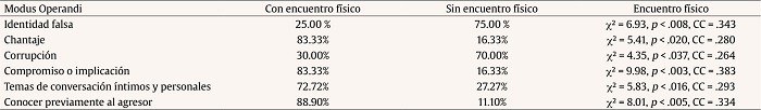 Los facilitadores que pudieron propiciar el encuentro físico fueron: el tema de conversación, el tipo de relación previo al proceso de abuso sexual y la estrategia persuasiva utilizada por el agresor durante el mismo. Se encontró que hablar sobre temas íntimos y personales de los menores, ya fuera de forma exclusiva o en combinación con otros temas, tenía relación con tener un encuentro físico (que tuvo lugar en 72.7% de los casos en los que se dio esta estrategia, 2 = 5.835, p < .016). Por otro lado, conocer al agresor antes de que el proceso de se iniciase también facilitaba el contacto físico (en un 88.9%, 2 = 8.013, p < .005). Por último, se ha encontrado que la estrategia de implicación es la que mayor relación tiene con llevar a cabo un encuentro físico (algo que se dio en un 83.33% de estos casos, 2 = 9.98, p < .003) También se observó que en aquellos casos en los que el chantaje estuvo presente, hubo un mayor grado de contacto físico (en un 83.33%, 2 = 5.41, p < .020) mientras que los contactos físicos fueron menores en los casos en los que los delincuentes utilizaron la estrategia del engaño empleando una identidad falsa (teniendo lugar sólo en un 30%, 2 = 5.23, p <.022) o usaron la corrupción. En la Tabla 5 se presentan características del modus operandi y su relación con el encuentro físico con la víctima