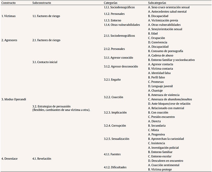 Para conocer el fenómeno de abuso sexual online en España y combatir mitos o creencias falsas al respecto se ha llevado a cabo un análisis de 20 sentencias condenatorias hechas públicas en los últimos años (2017-2021). En concreto, se exploraron las características sociodemográficas de víctimas y victimarios, las estrategias de persuasión empleadas por los victimarios y si estas varían en función del sexo de la víctima así como los factores que influyen en la probabilidad de que se llegue a producir un encuentro físico.