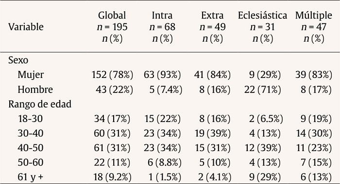 El 35% de los participantes confiesa haber sufrido violencia sexual intrafamiliar, el 25% extrafamiliar, el 16% violencia sexual eclesiástica, el 14% violencia sexual intraamiliar y extrafamiliar, el 4,6% extrafamiliar y eclesiástica, el 3.1% violencia de los tres tipos (es decir intrafamiliar, extrafamiliar y eclesiástica); finalmente, el 2.1% declara haber sido víctima de violencia sexual intrafamiliar y eclesiástica (ver Tabla 1).
