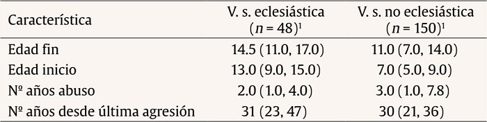 En la Tabla 2 se aprecia la edad de inicio y fin del abuso, el número de años durante los que se extendió y el tiempo trascurrido desde la última agresión, distinguiendo los abusos ocurridos en el contexto eclesiástico y en otros contextos.