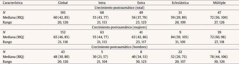 Las víctimas de violencia sexual infantil registran un crecimiento postraumático para la muestra total (N = 195) en un rango que va de 20 a 126 puntos, con una mediana de 60. En la Tabla 3 se detallan los estadísticos de crecimiento postraumático reportados por sexo de los participantes y tipo de violencia sexual.