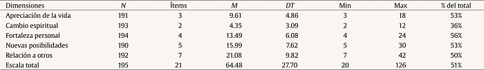 Tal como se puede apreciar en la Tabla 4, los participantes declaran que han tenido crecimiento postraumático tras la experiencia o experiencias de violencia sexual vividas durante su infancia en todas las dimensiones evaluadas.