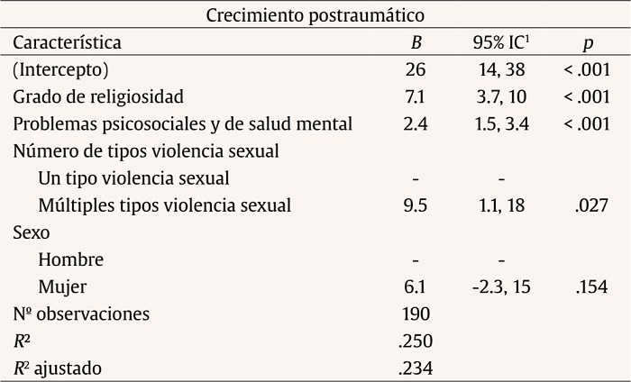 Ajustamos un modelo lineal (estimado mediante MCO) para predecir el crecimiento postraumático a través de las variables grado de religiosidad, problemas psicosociales y de salud mental, número de tipos de violencia sexual y sexo (fórmula: crecimiento post traumático ~ grado religiosidad + problemas psicosociales y de salud mental + num. tipos violencia sexual + sexo). El modelo explica una proporción moderada pero estadísticamente significativa de la varianza, R2 = .25, F(4, 185) = 15.44, p < .001, R2 ajustado = .23. El intercepto del modelo, correspondiente a grado religiosidad = 0, problemas psicosociales y de salud mental = 0 y número de tipos violencia sexual = un tipo violencia sexual y sexo = hombre, es de 26.25, 95% IC [14.37, 38.13], t(185) = 4.36, p < .001.