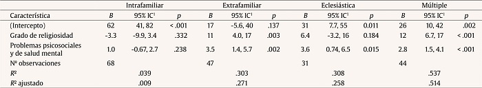 A continuación, aplicamos el mismo modelo segmentando la muestra en cuatro grupos, de acuerdo al tipo de violencia sexual (intrafamiliar, extrafamiliar, eclesiástico y múltiple). En todos los casos, ajustamos un modelo lineal (estimado mediante MCO) para predecir el crecimiento postraumático mediante las variables independientes grado de religiosidad y problemas psicosociales y de salud mental (fórmula: crecimiento postraumático ~ grado de religiosidad + problemas psicosociales y de salud mental). Los parámetros estandarizados se obtuvieron ajustando el modelo en una versión estandarizada del conjunto de datos. Los intervalos de confianza (IC) se calcularon al 95 % y los valores p se calcularon utilizando una aproximación de la distribución de Wald.