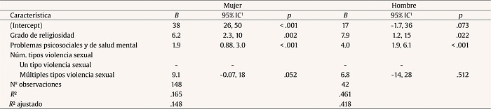 Separando la muestra por sexo obtenemos resultados cualitativamente similares a los mostrados en el modelo global, con la excepción de número de tipos de violencia sexual, que deja de ser significativa (p = .052 y p = .512 para mujeres y hombres, respectivamente) y la varianza explicada por los modelos (R2 ajustado), que pasa a ser de .148 para las mujeres y .418 para los hombres.