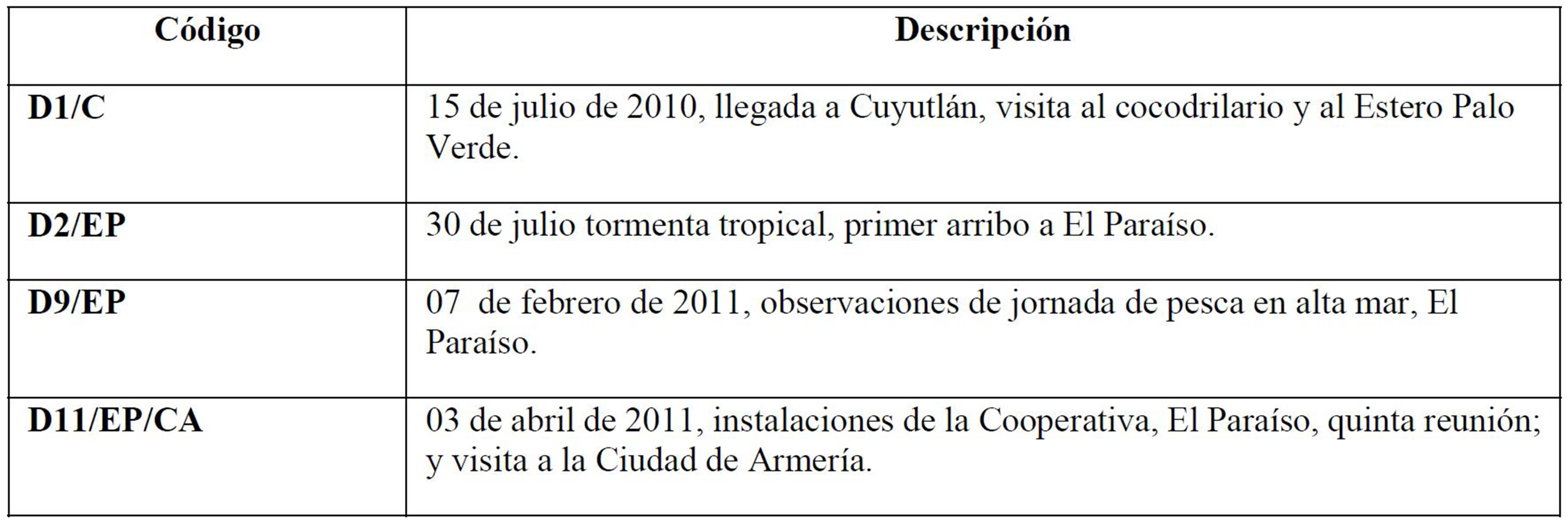 La codificación de los diarios de campo está constituida por una letra “D” que hace referencia a Diario, seguida de un número, separado por una diagonal, y posteriormente las iniciales del o los lugares visitados, por ejemplo:
