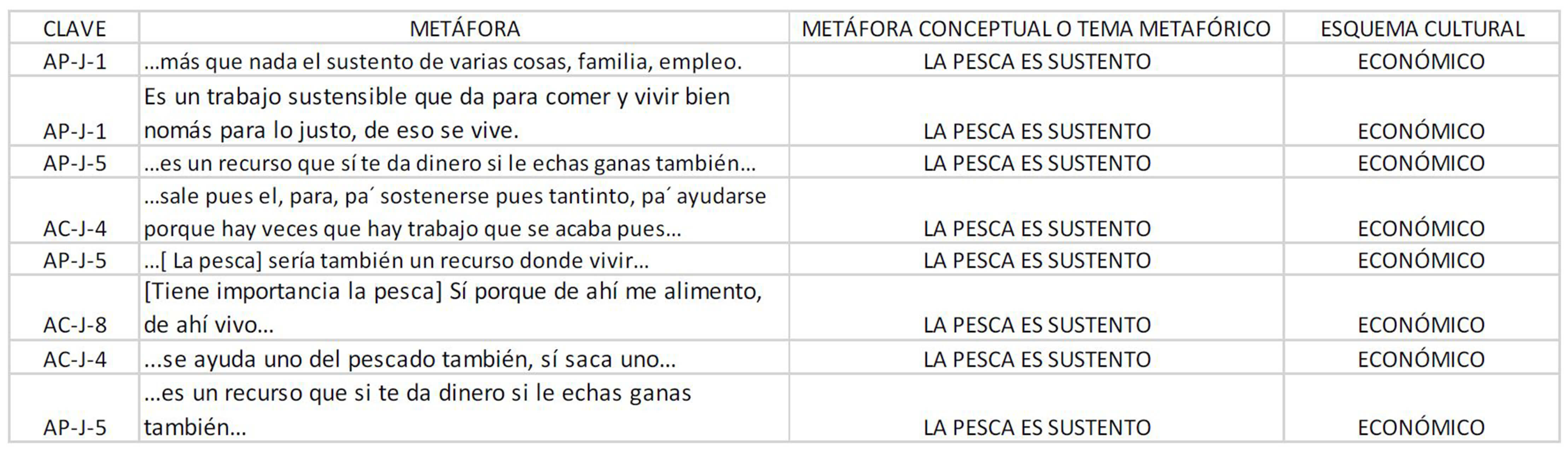 Por ejemplo, se ubicó entre otros, el tema metafórico denominado: LA PESCA ES SUSTENTO, ya que para la mayoría de los informantes el término “sustento” tiene como sinónimos: “manutención”, “soporte”, “apoyo”, “sostén” y se visualiza como parte de la economía no solamente en términos individuales, sino también en cuestiones familiares y grupales.