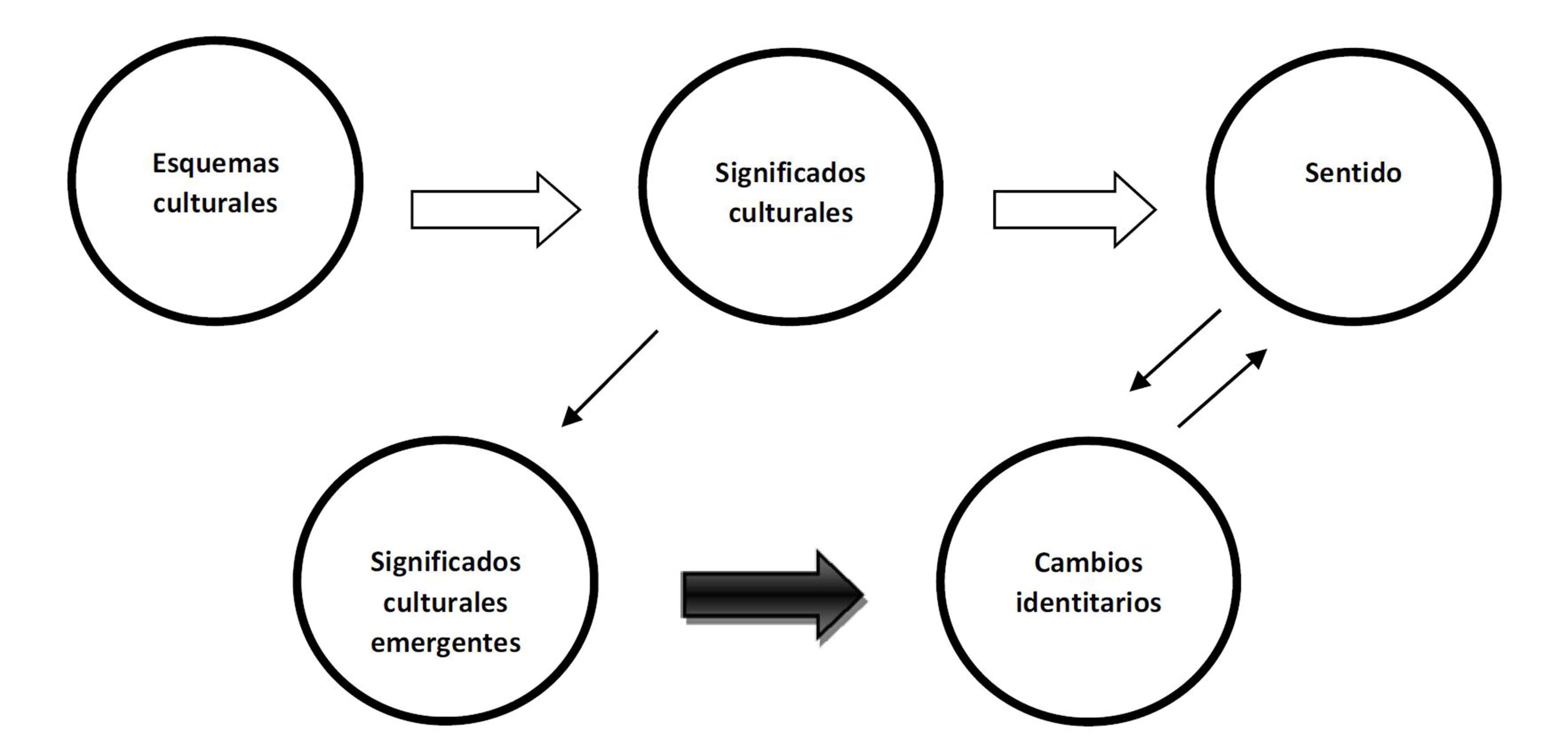 Para ello, recordemos que existen Esquemas Culturales que los jóvenes reconceptualizan al aplicar una significatividad de concepciones convencionales a situaciones nuevas y así se origina un fenómeno denominado por Palmer (2000) como: significado emergente; con ello se propone la tesis de que se producen procesos de cambio en los significados con cargas de innovación; como resultado, este fenómeno también influye en el cambio cultural y a su vez en el cambio identitario.