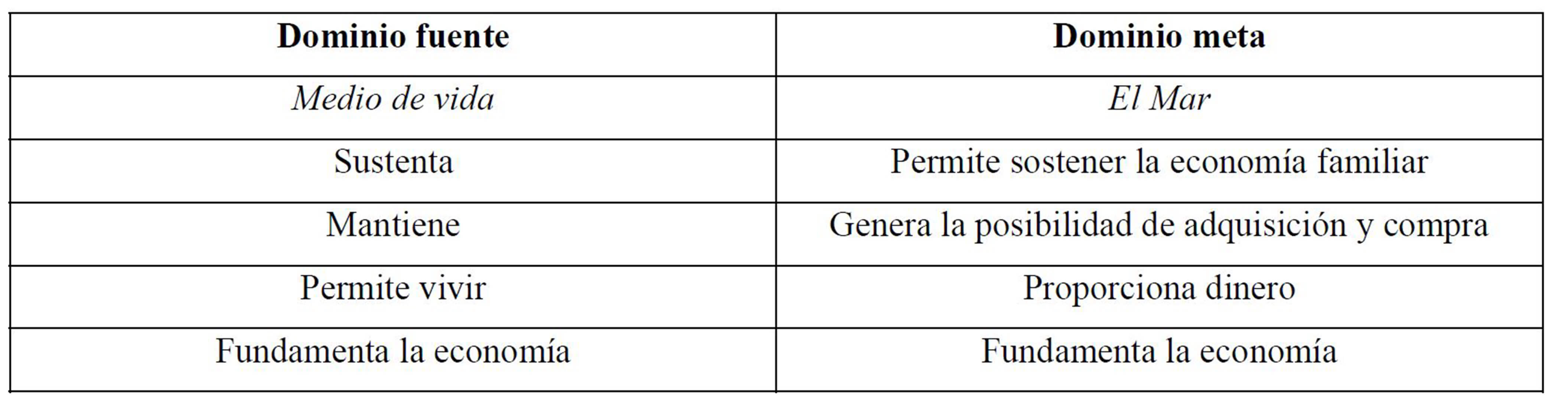 De esta manera, el dominio fuente que se refiere al ámbito más concreto se usa para explicar cuestiones más abstractas que se expresan dentro del dominio meta o destino. Esto se deduce por los atributos que le confieren los pescadores al mar en la pesca artesanal: “del mar también vivimos”, “permite vivir”, “mantiene”, “es un modo de sustento”, “sustenta”, “permite vivir”, “depende uno”, “fundamenta la economía”.
