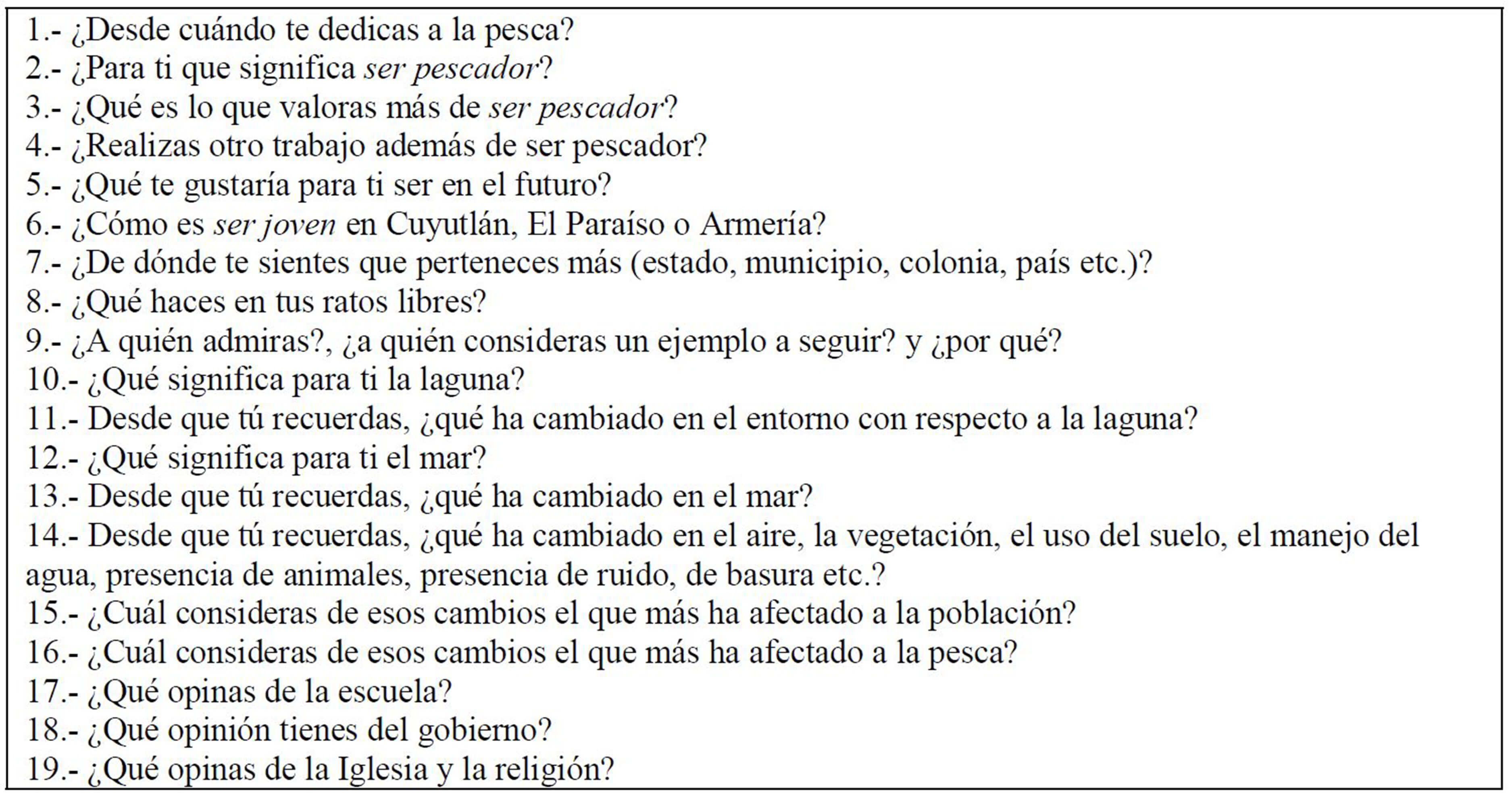 Con el fin de mostrar la metodología que se construyó para la elaboración de la presente investigación, se iniciará con las siguientes preguntas: ¿cómo se genera la identidad del joven pescador a partir de los E C?; ¿cuáles son esos E C que presentan los jóvenes pescadores de Armería?; ¿cómo son integrados y reproducidos actualmente los E C dominantes de trabajo en un contexto de cambio?